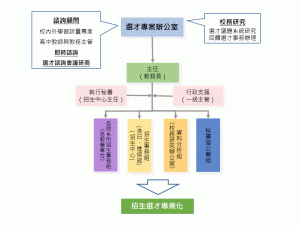 本校「選才專案辦公室」為教務處所屬單位,由教務長擔任辦公室主任、招生策略中心主任為執行秘書,聘2位專案約聘人員專責選才專案人員。